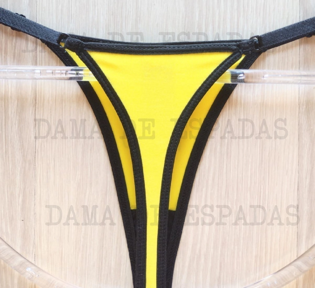 Kit de 4 calcinhas na cor amarela com acabamentos em preto.