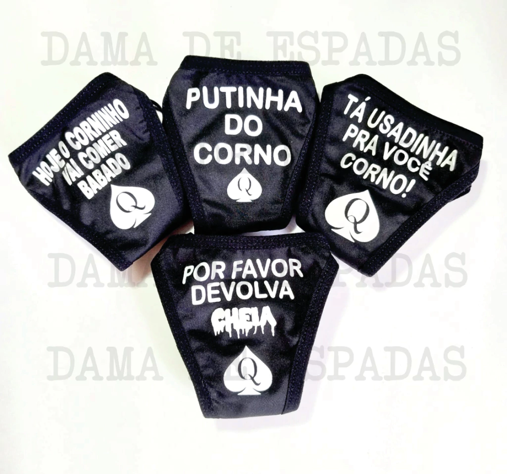 Kit de 4 calcinhas Hotwife, Cuckold, Pretas com estampas brancas, Putinha do Corno, Por favor devolva cheia, Tá Usadinha Pra Você Corno e Hoje o Corninho Vai Comer Babado.
