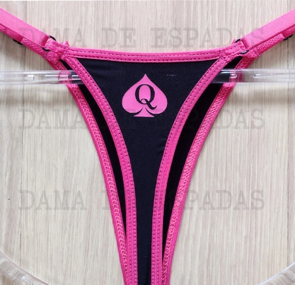Linda calcinha preta com acabamentos em rosa, estampa Nº FUCK ME! e estampa DAMA Nº 03 atrás.